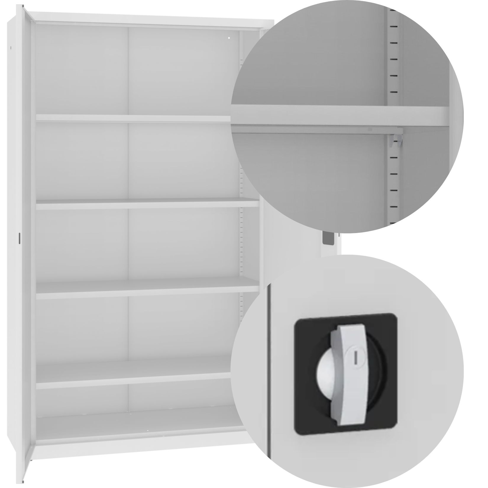 Przedstawiany model proponuje dużą ilość miejsca do przechowywania, dzięki czterem przestawnym półkom w odstępch co 2,5 cm. Dodatkowo metalowa szafa jest wyposażona w dwupunktowy zamek kluczowy, który blokuje dostęp do jej wnętrza przed osobami niepowołanymi!