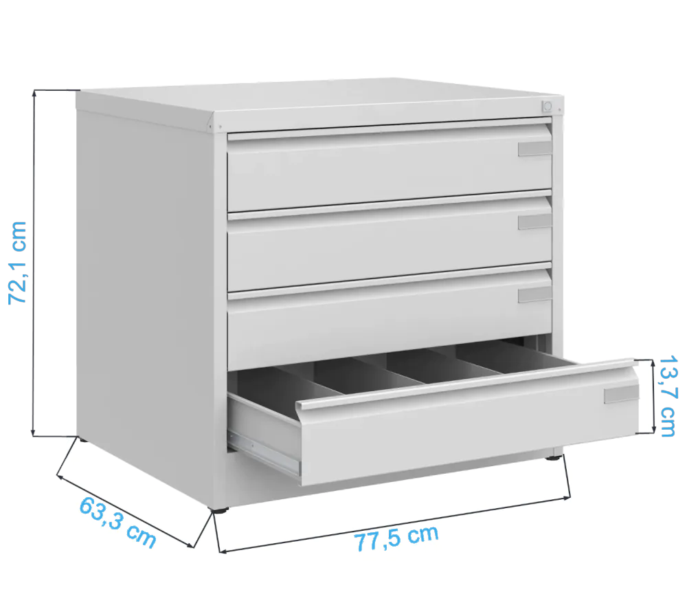 Szuflady wyposażone są w prowadnice kulkowe z podwójnym wysuwem, posiadające specjalne zabezpieczenie, które eliminuje ryzyko przypadkowego wysunięcia. W każdej szufladzie umieszczono cztery ruchome przegrody, co zwiększa możliwości organizacyjne. Szafa charakteryzuje się dużą wytrzymałością i stabilnością, wynikającą z zastosowania blachy ocynkowanej oraz stalowej w jej konstrukcji.