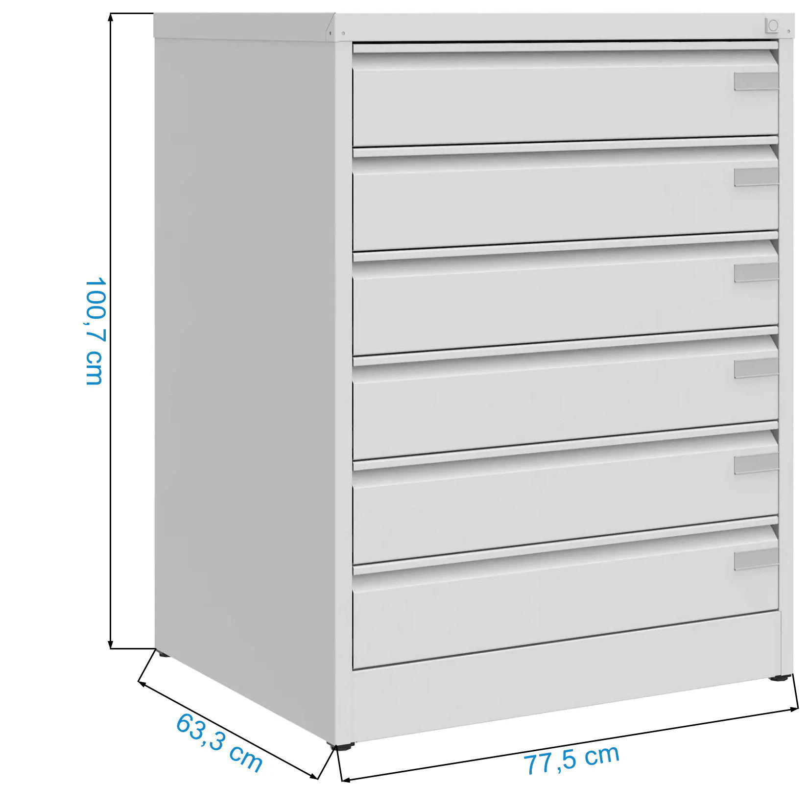 Szafa biurowa SZK 203 ST to efektywne rozwiązanie dla organizacji obszernych zbiorów dokumentów. Udostępnia sześć szuflad przystosowanych do przechowywania czterech rzędów teczek zawieszkowych formatu A6, przy maksymalnym obciążeniu do 50 kg każda. Wykonana z blachy stalowej wysokiej jakości i blachy ocynkowanej, zapewnia długotrwałe użytkowanie. Ta metalowa szafa dokumentowa spełnia normy RODO, wyposażona jest w zaawansowane systemy zabezpieczeń: prowadnice teleskopowe, centralny system ryglowania i mechanizm zapobiegający wypadnięciu szuflad. Etykiety samoprzylepne ułatwiają szybką identyfikację zawartości. To idealne wyposażenie dla biur, instytucji publicznych oraz kancelarii prawnych wymagających niezawodnego systemu archiwizacji dokumentów.